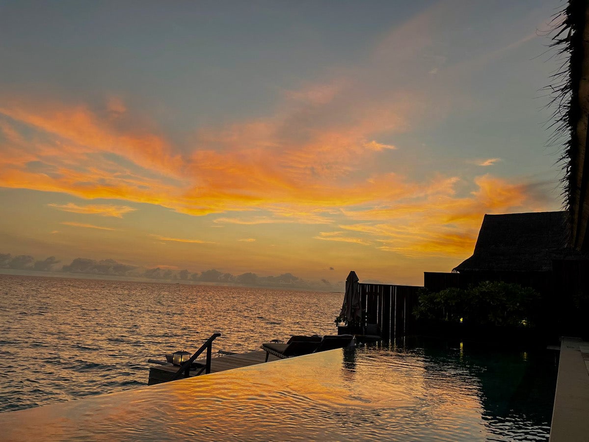 Die Sonnenuntergangs-Wasservilla war unschlagbar. Mit einem privaten Infinity-Pool bot sie den perfekten Ort, um die Tage ausklingen zu lassen. Die Sonnenuntergänge dort waren einfach magisch – privater und romantischer ging es nicht. Ich habe jede Minute genossen und empfand diese Villa als die schönste Wasservilla, die ich je auf den Malediven gesehen habe. Tagsüber war ich auch gerne am Hauptpool, um ein bisschen Abwechslung zu haben.