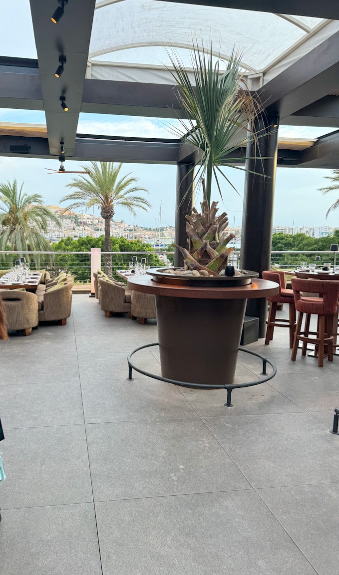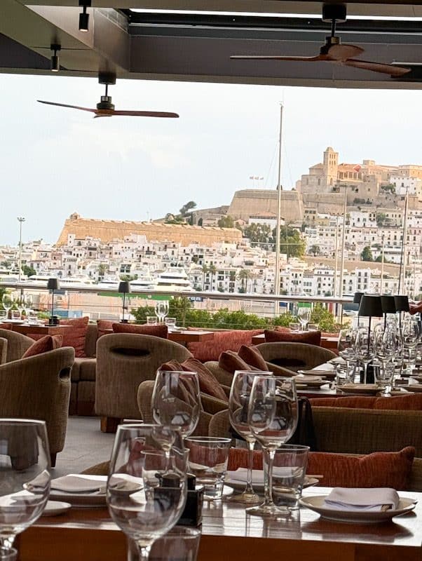 Die offene Küche gewährt spannende Einblicke in die Zubereitung der Gerichte, während die Außenterrasse mit ihrem traumhaften Ausblick auf das Mittelmeer und die stimmungsvolle Altstadt von Ibiza eine magische Kulisse für einen unvergesslichen Abend bietet.
